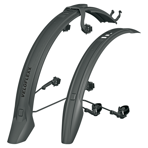 Комплект крыльев VELOFLEXX сочетает в себе устойчивость и защиту от воды и грязи фиксированных полноразмерных крыльев с гибкостью и удобством использования быстросъёмных. Крылья совместимы с дисковыми тормозами. Крепление VELOFLEXX позволяет крепить их без использования инструментов с помощью резиновых ремней. Адаптеры для рамы позволяют устанавливать их на любую вилку, угол наклона можно регулировать.