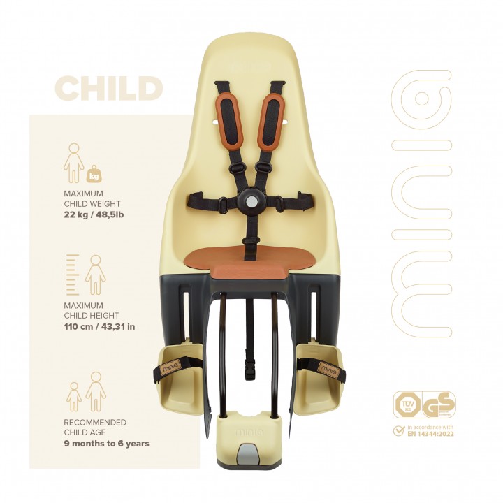 Складное детское велосипедное сиденье с креплением сзади, предназначенное для детей от 9 месяцев до 6 лет, с максимальной грузоподъемностью 22 кг. Подходит для городских велосипедов, горных велосипедов и электровелосипедов. Для круглых и овальных рам: Ø28–40 мм.